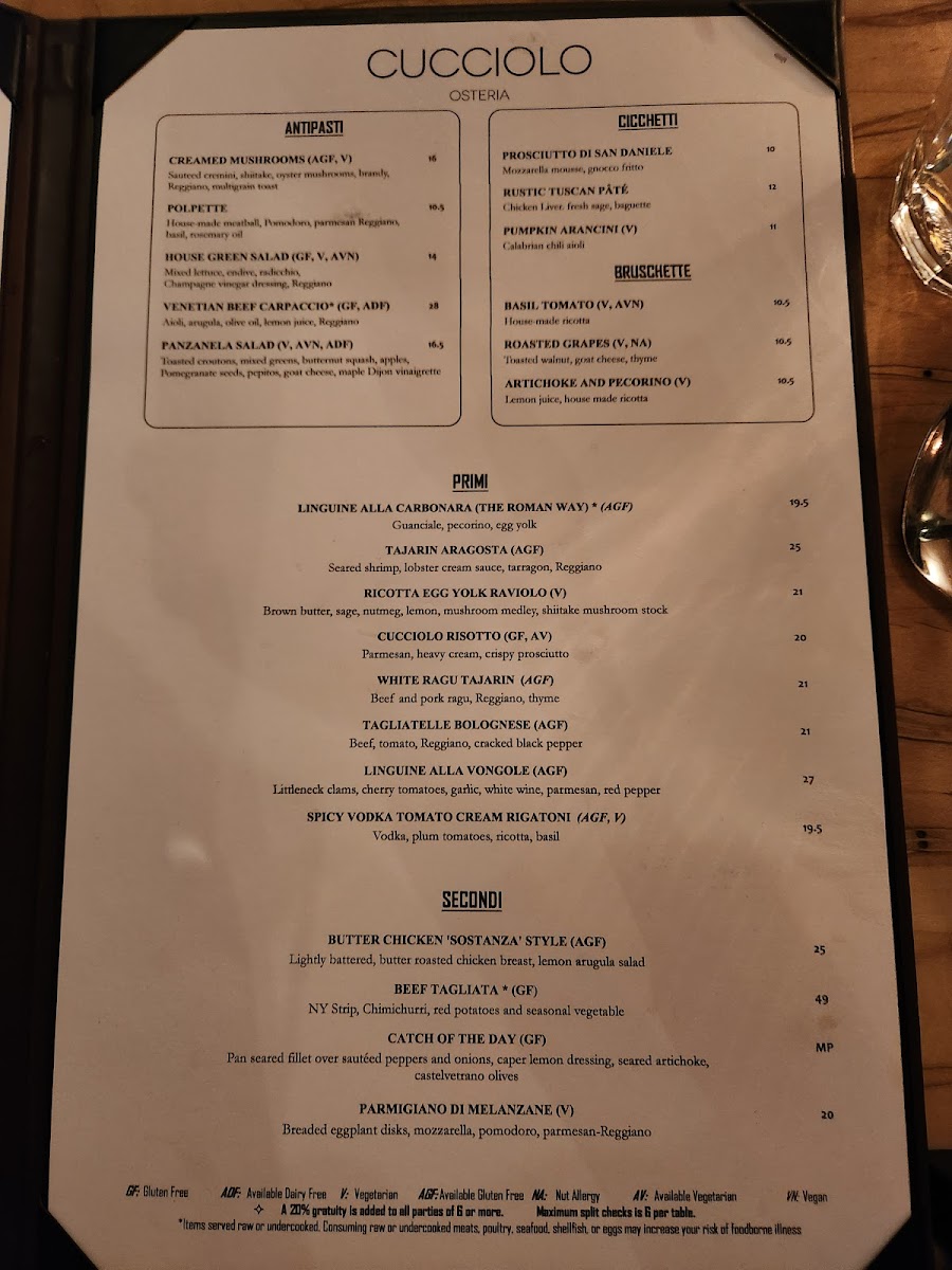 Cucciolo Osteria specializes in an array of authentic Italian dishes designed to tantalize your taste buds and inspire joy. The menu is a delightful exploration of delectable cicchetti, bruschette, and secondi that showcase the rich flavors and creativity characteristic of Italian cuisine. Start your meal with the Prosciutto di San Daniele paired with creamy mozzarella mousse and crispy gnocco fritto at just $8.50. The Rustic Tuscan Pâté served with fresh sage and baguette is another must-try at $10.50, offering a savory introduction to your Italian feast.